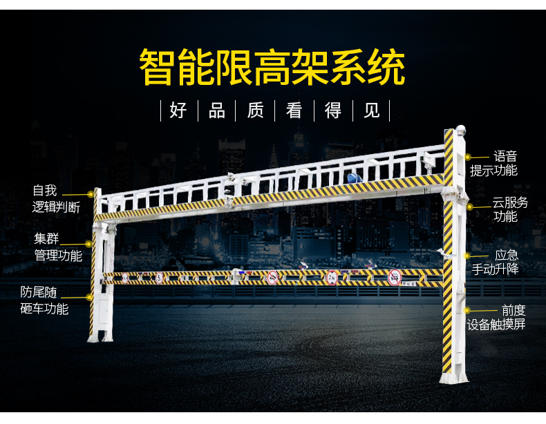 自我邏輯判斷:當車輛緩行沒有按規定時間通過,限高架自動 識別不再下降, 車輛通行完畢后可自動回位到設定高度 ;